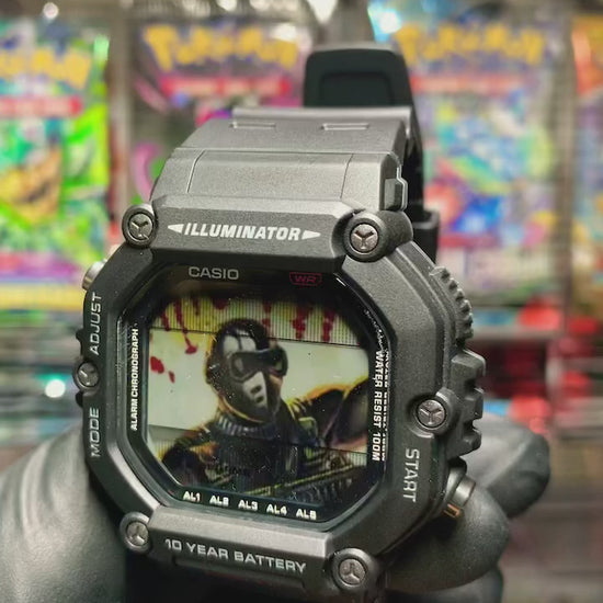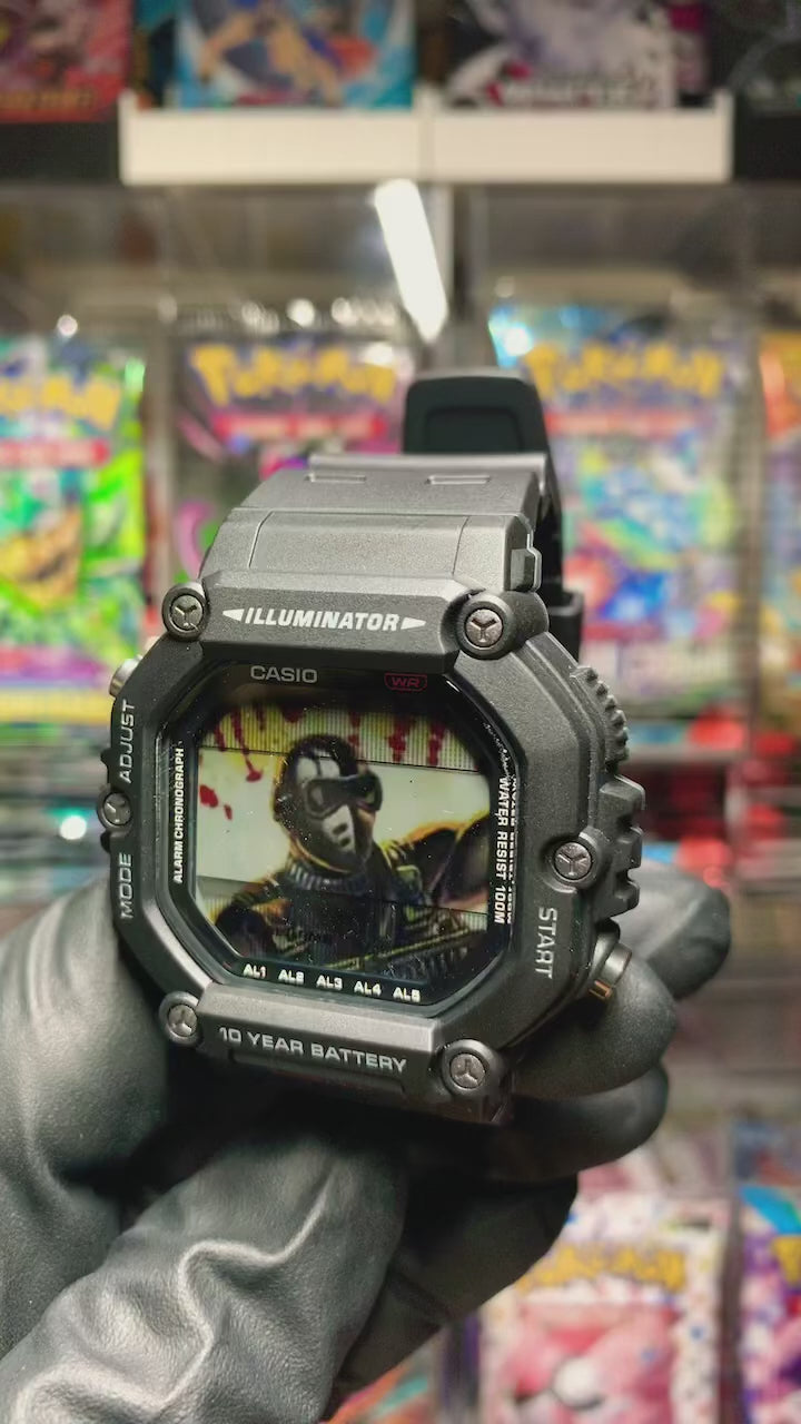This is a customized genuine Casio Illuminator AE-1600H-1AV. My customization process is not simply a color overlay or a simple image drop in. The LCD screen floats atop the image and disappears when viewed at particular angles to show off the character. Be sure to watch the video to see this in action. All functionality of the watch is maintained. Comes with customized ball display package. See my other listed customs and know that I am open to building a watch with any image you may want.